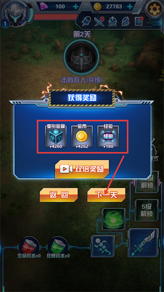 4、完成目标后弹出【获得奖励】界面,可获取【变形金属-+4260】等道具,选择【双倍奖励】或点击【下一天】推进关卡。