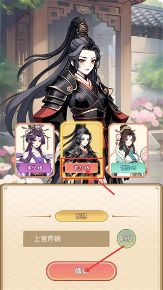 2、进行角色关联操作时,可选择【上官芹娴】或点击【随机】选对应角色,完成后点【确认】,可获得【家室+5】【主办+5】等的增益。