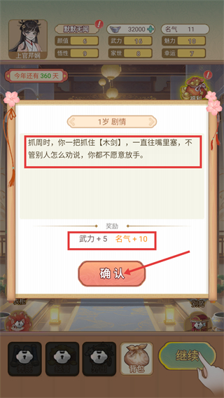 4、触发【1岁-剧情】的【抓周时你一把抓住【木剑】一直往嘴里塞】事件后,可获得【武力+5-名气+10】的奖励,点击【确认】继续游戏。