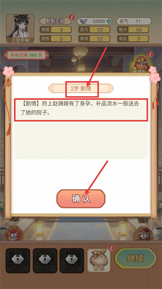 1、触发【2岁-剧情】时,按提示处理【府上赵姨娘有了身孕】的事件,将【补品流水一船】送去其院子,完成后点击【确认】推进流程。