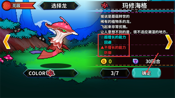 2、选择【玛修海格】这只蘑菇转世的植物系龙,需注意其擅长【回避】、不擅长【防御】,确认【COLOR-红】【3/7】后点【确定】选定。