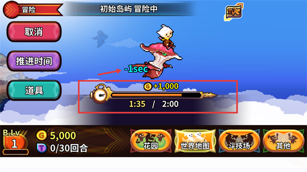 4、处于【初始岛屿-冒险中】时,可通过【推进时间】加速进度(当前【1:35/2:00】),还能获取【+1000】金币,按需用【道具】辅助。
