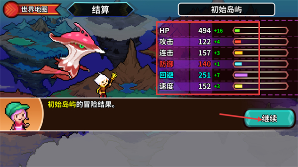 1、完成【初始岛屿】的冒险后进入结算,可查看【HP-494+16】【攻击-122+4】等属性提升,点击【继续】按钮推进流程。