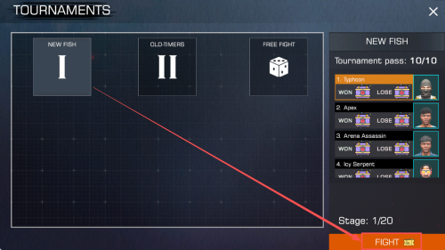 2、选择比赛:在比赛选择界面,点击“FIGHT”按钮开始比赛。