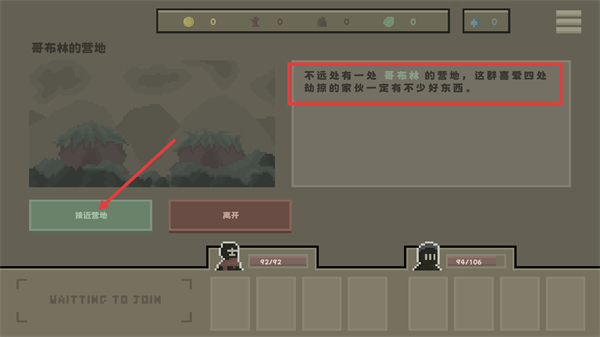 2、发现【哥布林的营地】,界面提示该营地有哥布林的物资,点击【接近营地】按钮可进一步探索该区域。