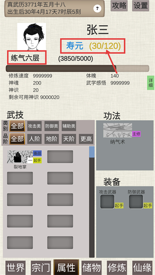 1、在属性界面确认【炼气六层】状态,留意【寿元-(30/120)】余量,将【裂地掌】设为备战武技,搭配【纳气术】提升初期战力。