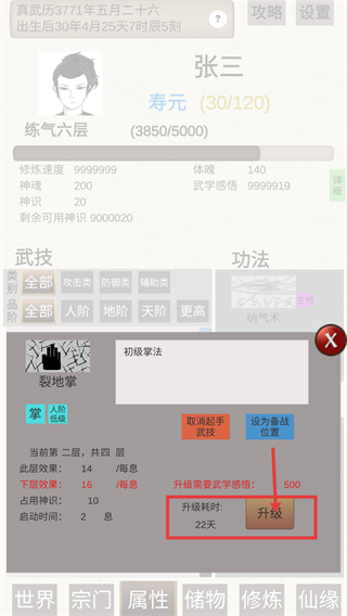 2、针对【初级掌法-裂地掌】,消耗【武学感悟-500】点击【升级】,虽耗时【22天】,但能提升其每层效果增强输出。