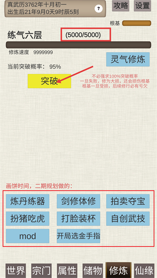 3、当【炼气六层-(5000/5000)】时,95%突破概率即可尝试【突破】,无需强求满概率,避免根基受损影响后续。