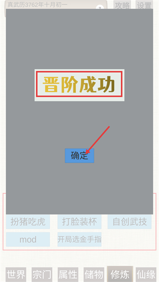 4、看到【晋阶成功】提示后,点击【确定】关闭弹窗,返回界面查看晋阶后属性提升,为后续修炼做准备。