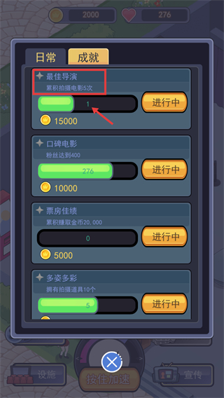 1、成就界面中,【最佳导演】需累积拍摄电影5次,当前进度1,完成该成就可获取【15000】金币,建议优先推进。