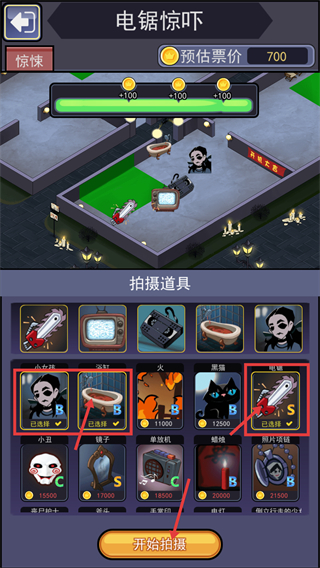 3、【电锯惊吓】拍摄界面中,确认【预估票价-700】,选好对应拍摄道具后,点击【开始拍摄】推进电影制作流程。