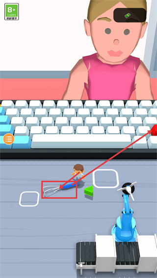 2、操作角色获取【蓝色道具】,将其对应键盘上的【红色按键】位置,配合【机械臂】设备,推进道具与按键的匹配流程。