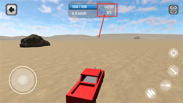 2、进入关卡后,留意顶部【508/508】状态与【02:07】计时,通过左侧摇杆控制车辆移动,右侧功能按钮辅助操作。