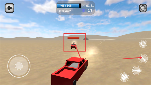3、战斗中观察敌方车辆血条,留意自身【466/508】状态,点击右侧功能按钮发起攻击,同时控制车辆调整位置。