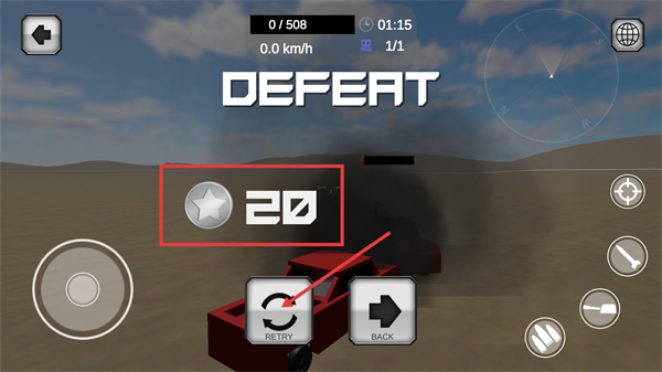 4、战斗失败会显示【DEFEAT】,可获得【20】星星奖励,点击【RETRY】重新挑战,或选【BACK】返回关卡界面。