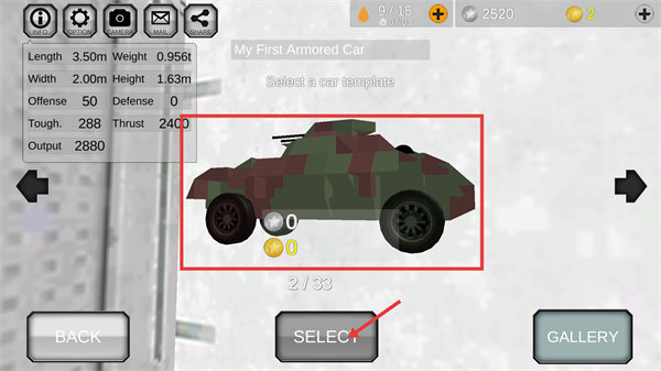 1、在车辆模板选择界面,查看【My-First-Armored-Car】的参数,确认后点击【SELECT】按钮,即可选用该装甲车辆。