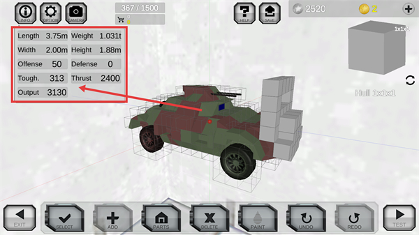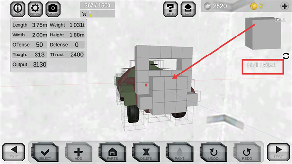 2、进入车辆编辑界面,选择【Hull-1x1x1】模块,通过底部【ADD】按钮添加部件,逐步构建车辆结构。