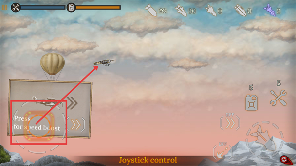 1、在飞行关卡中,按【Press-for-speed-boost】按钮获速度加成,操控飞机时留意顶部进度条,同时关注【30】枚火箭等弹药储备。
