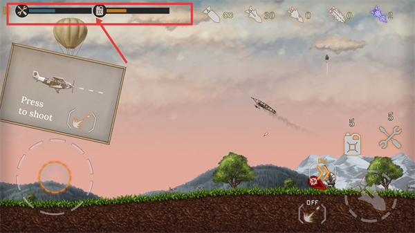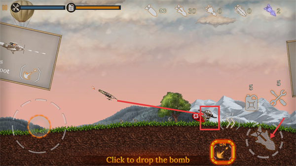 2、遇到敌方飞机时,点击【Click-to-drop-the-bomb】投掷炸弹,借助地面武器辅助攻击,确保【ON】状态的投掷功能正常启用。