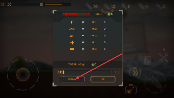 4、若出现【MISSION-FAILED】提示,可点击【REPLAY】重新挑战关卡,复盘操作提升命中率,避免再次获得【0】总XP的结果。