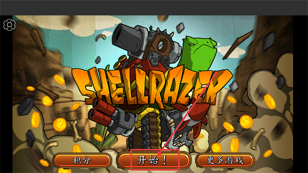 1、在启动界面,确认【SHELLRAZER】主题场景后,点击【开始!】按钮进入对局,同时锁定场景内的【金币】作为收集目标。
