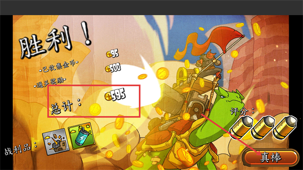 4、通关后将获得【已收集金币-95】与【通关奖励-500】,合计【总计-595】的资源,点击【真棒】按钮结算并进入下一关。