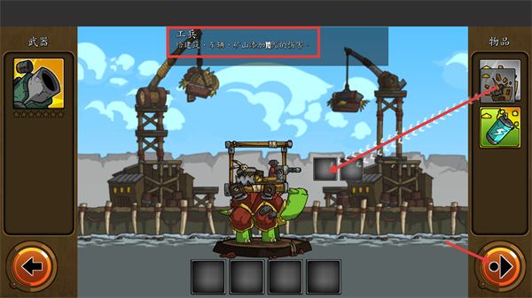 1、选择【工兵】增益,其能给【建筑-车辆-矿山】添加10%的伤害,同时可通过两侧箭头按钮切换界面,查看【武器】与【物品】栏内容。