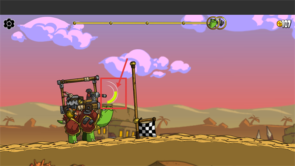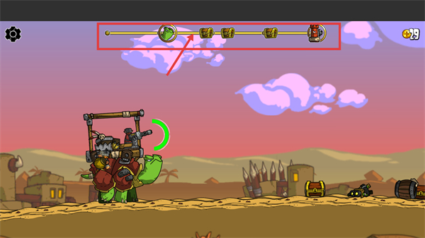 2、推进关卡时关注顶部进度条,跟随【青蛙标识】的进度节点,清理场景内的宝箱获取资源,同时留意武器的蓄力状态。