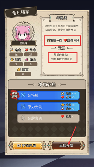 1、角色档案中【毕鲁赫】的天赋为【收拢的直发-你拥有收拢的直发】,开局可选【金箍棒-攻击+10-生命+5】等外挂,选择提升初始属性。