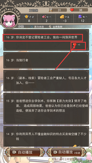 3、16岁决定不登记冒险者工会-独闯世界,会获得【生命+1】的增益,同时保留【原力光剑】等初始道具推进成长。