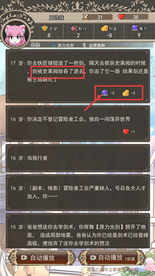 4、17岁造剑后遇史莱姆被吞,会触发【财富-3-智力-5】的属性变动,后续需留意规避此类随机负面事件。