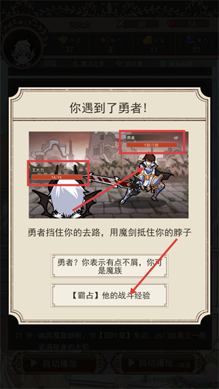 2、遇到勇者挡路时,使用已解锁的【霸占之手】选择【霸占-他的战斗经验】,触发与勇者的互动进程。