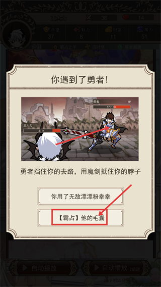 3、对战勇者过程中,再次触发【霸占】功能,选择【霸占-他的毛囊】,进一步推进当前对战的发展节奏。