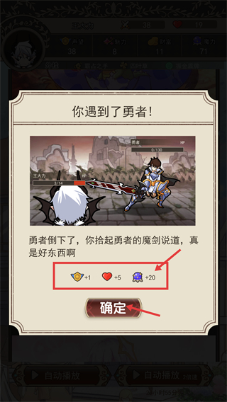 4、击败勇者后,领取【声望+1-生命+5-魔力+20】的结算奖励,点击确定完成流程以提升角色多维度属性。