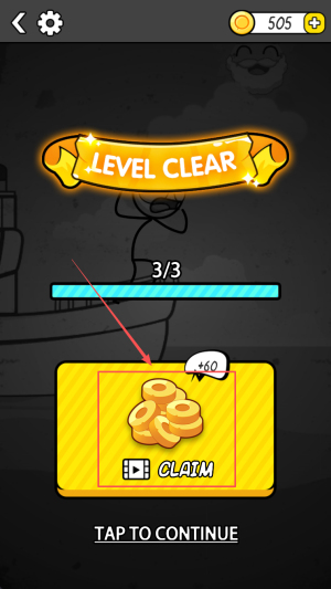 4、领取奖励:在505+LEVEL CLEAR 3/3+60点击IDI CLAIM领取金币。