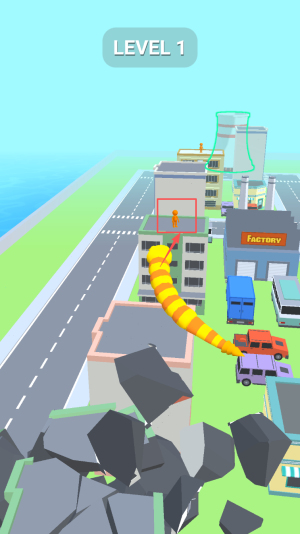 2、滑动控蛇破坏:通过手指滑动控制贪吃蛇移动方向,瞄准城市建筑发起冲击,触发建筑坍塌效果,完成基础破坏任务。