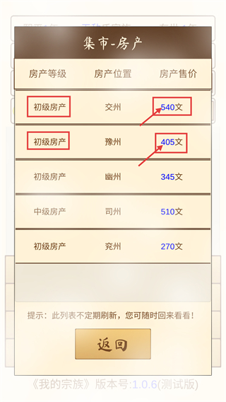 2、在【集市-房产】界面中,可选择【初级房产】,交州售价【540文】、豫州【405文】,消耗铜钱购置以增加宗族收入。