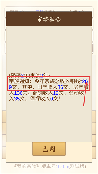 3、查看【宗族报告】可知本年总收入铜钱*【269文】,含【房产收入】等项,确认信息后点击【已阅】关闭报告继续发展。