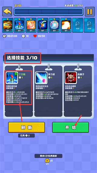 3、在【选择技能-3/10】阶段,可选择【三叉戟】这类范围持续伤害技能,确认后点击【开始】推进关卡进程。