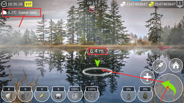 1、在Sawailake(当前环境温度8.5℃)的垂钓界面,选定【6.4m】区域完成下钩操作,准备开启本轮垂钓流程。