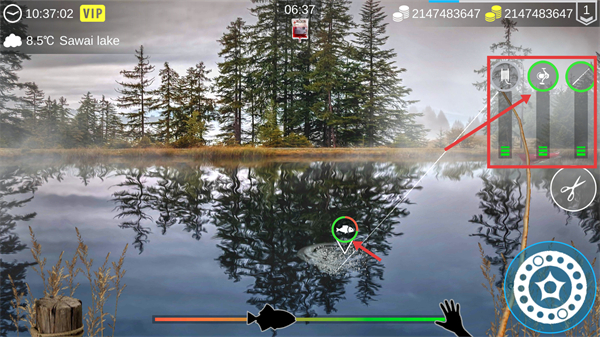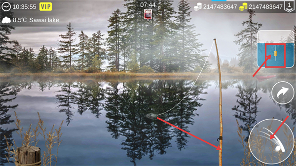 2、当浮漂出现异动时,通过界面右侧的鱼竿操作按钮完成咬钩环节的互动,触发鱼的咬钩状态。