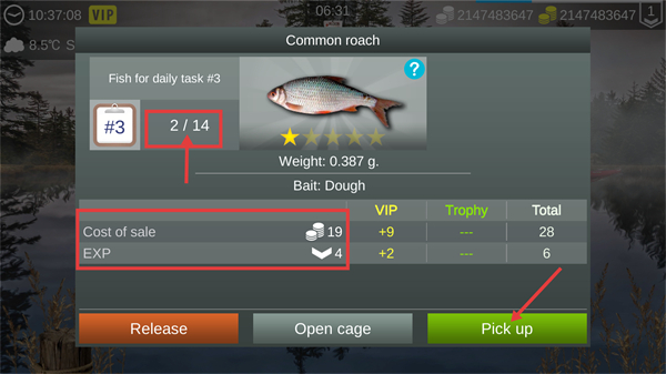 4、成功钓获【Commonroach】:该渔获对应日常任务#3,使用饵料为Dough,可获得19货币与4经验,点击【Pickup】收取本次收获。