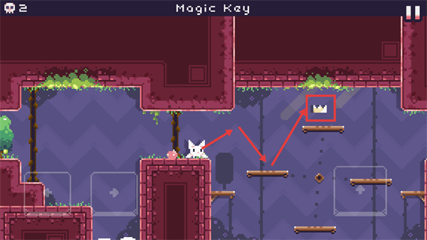 2、处于【Magic-Key】场景时,操控角色借助平台跳跃,靠近上方皇冠类道具,收集该道具以积累当前关卡的进度。