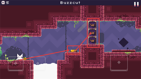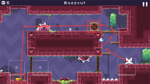 2、处于【Buzzcut】场景时,先操控角色获取下方道具,再借助平台跳跃至上方带叉方块处,解锁该机关推进关卡。