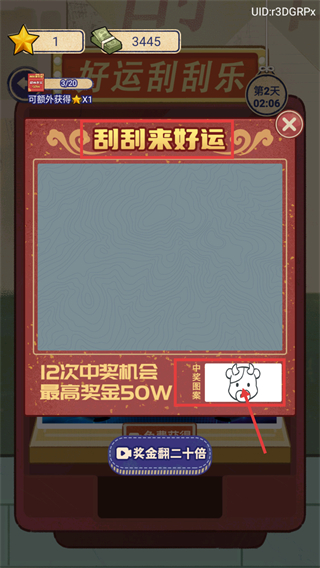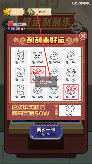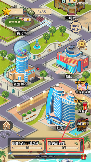 1、在主界面(进度:第2天01:24),点击底部“购买刮刮乐”选项(每日限1次),进入“好运刮刮乐”界面。