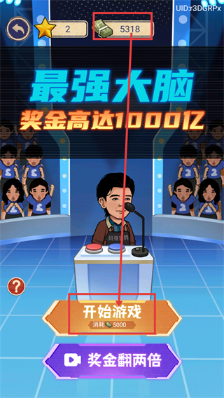 1、进入“最强大脑”玩法界面(当前金钱5318),点击“开始游戏”按钮(消耗5000金钱),进入答题挑战环节。