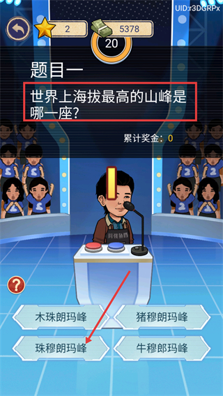 2、题目一:“世界上海拔最高的山峰是哪一座?”,选择正确选项“珠穆朗玛峰”,完成该题的作答。