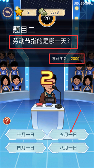 3、题目二:“劳动节指的是哪一天?”,选择正确选项“五月一日”,作答后累计奖金更新为2000。