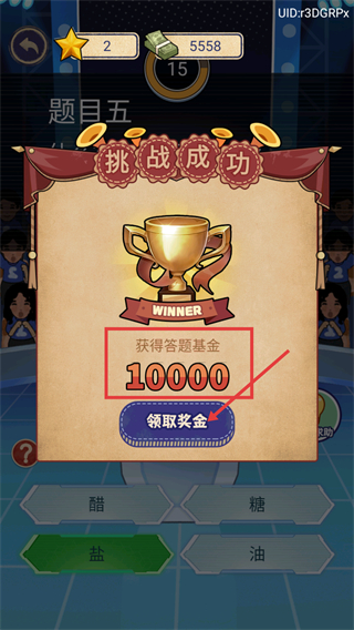 4、完成答题挑战后,界面显示“挑战成功”,获得10000答题基金,点击“领取奖金”按钮,获取奖励。