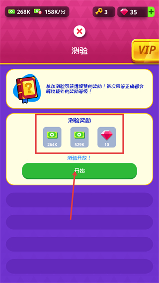 1、在测验界面查看【测验奖励】-264K、529K、10钻石,点击【开始】参与测验,正确答题可解锁额外奖励等级。